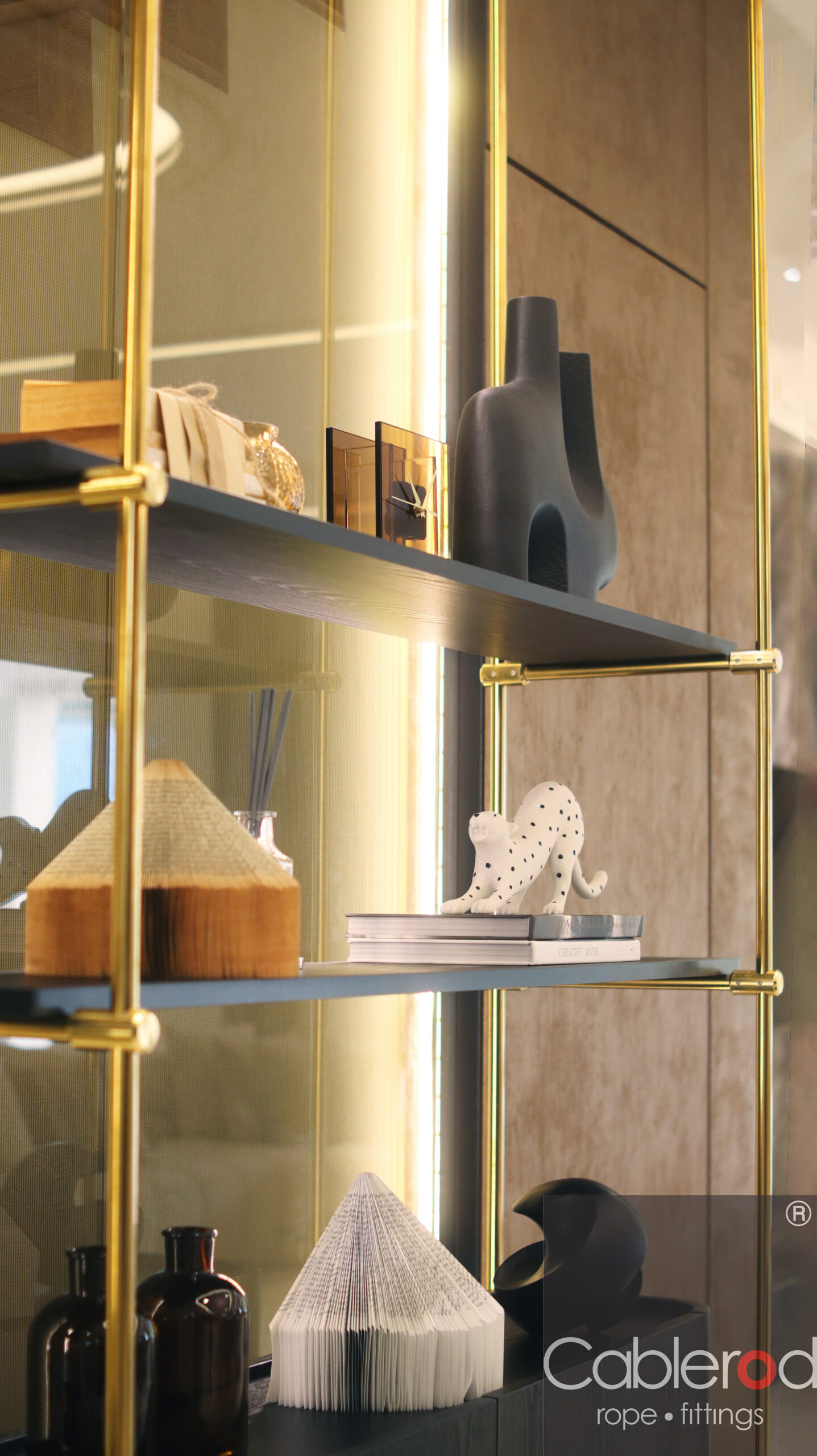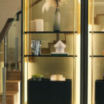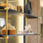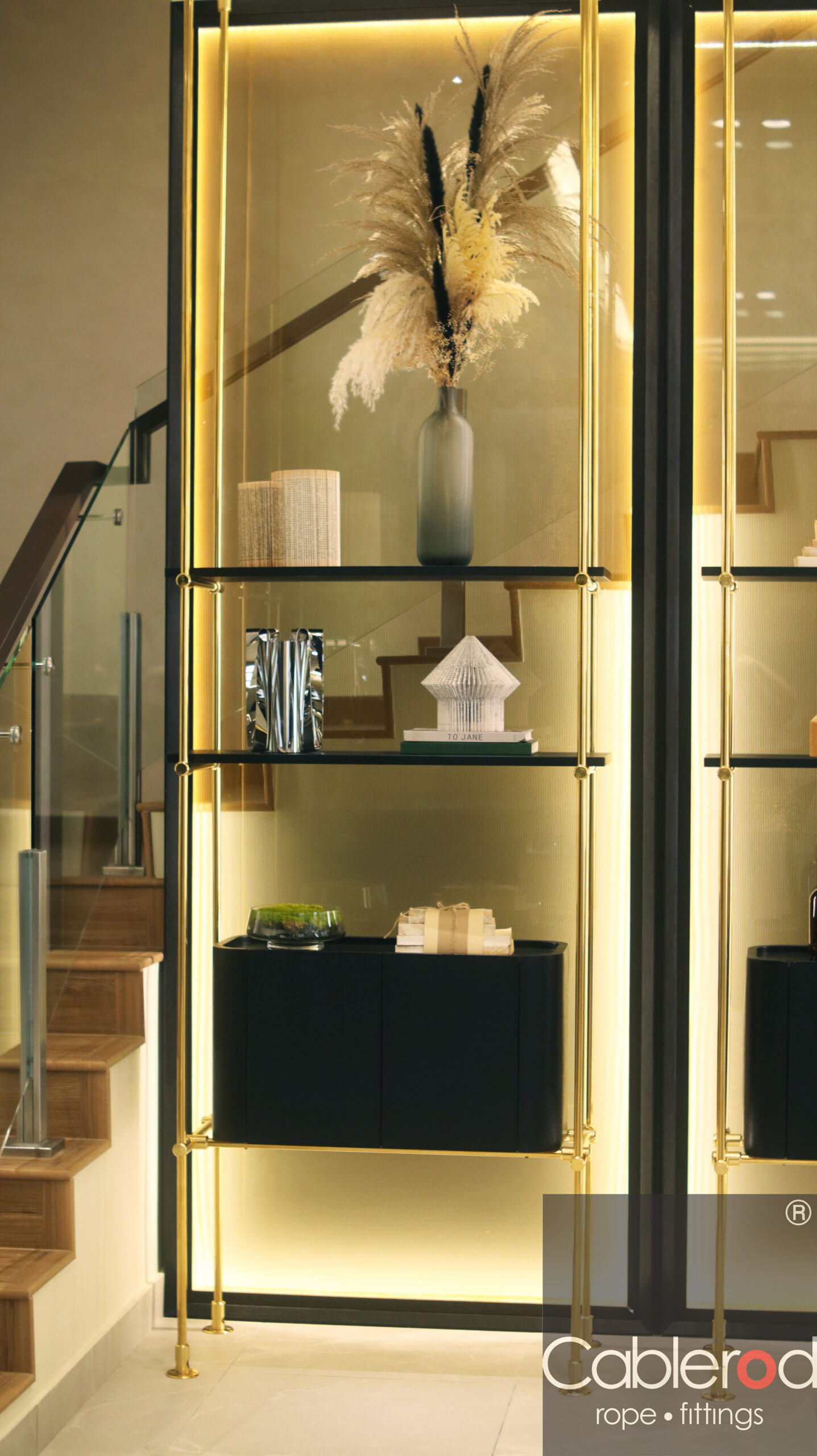 This project explores a modern luxe interior concept, where the living room transitions seamlessly into the stairwell area. A full-height rod display structure defines the space with a sleek, gilded finish — a treatment increasingly favored by designers for its clean and sophisticated expression.