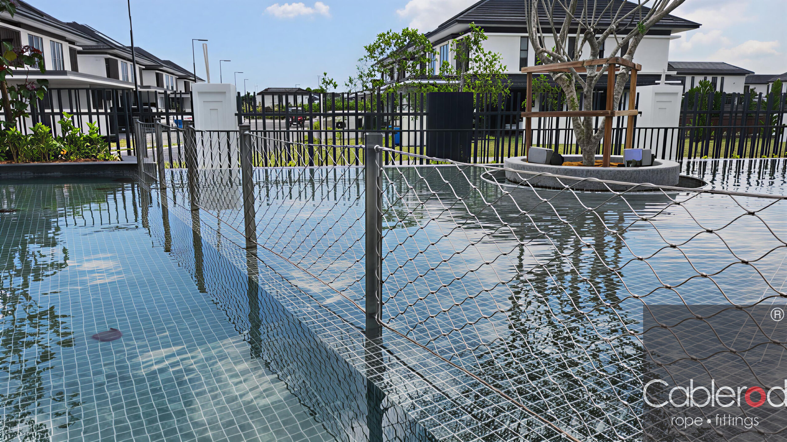 The lightweight structure blends seamlessly with the landscape, allowing airflow and natural light to pass through while providing a reliable boundary between zones. The minimal cable pattern keeps sightlines clear, giving the pool deck a refined and unobtrusive finish.